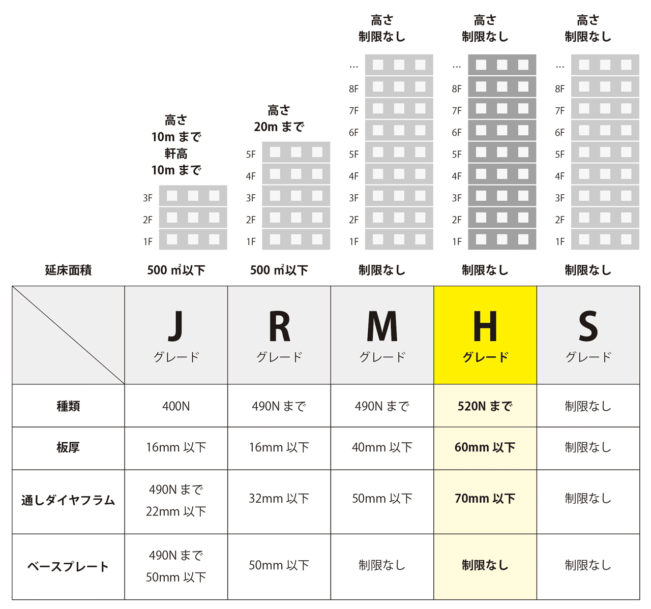 認定にはグレードが存在します。組織体制、資格者の有無や配置状況、製造設備、検査設備の有無、品質管理状況、検査方法、社内教育について詳細な書類審査と工場審査を繰り返し、届け出たグレードが承認されます。グレードによって、建造物の高さ、延べ面積、取り扱う鋼材の種類が決定します。